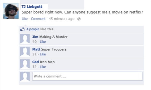 Let’s look at a real life example using social media.  On Facebook, someone might make the post “Super bored right now.  Can anyone suggest me a movie on Netflix?”